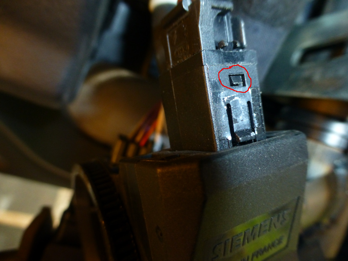 voici une autre vue du connecteur à débrancher. J'ai appuyé sur la petite languette entourée de rouge. Et le côté du clips s'est enlevé.