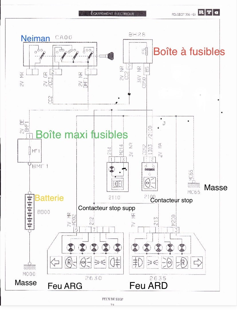Voici le schéma électrique Peugeot 306 pour identifier le fusible du contacteur redondant de frein ici c’est le F5 contrairement à la 406 qui est le F3.