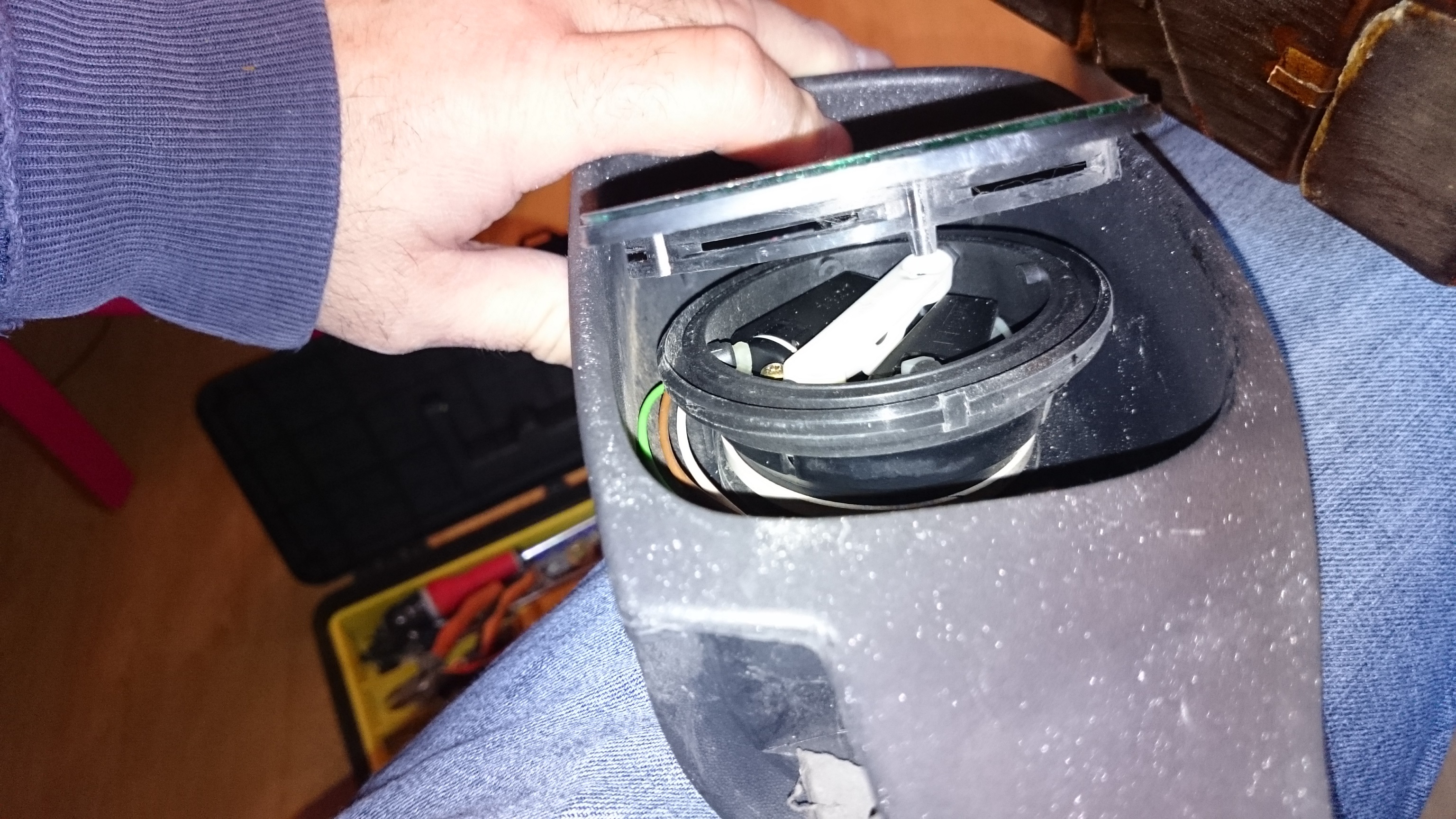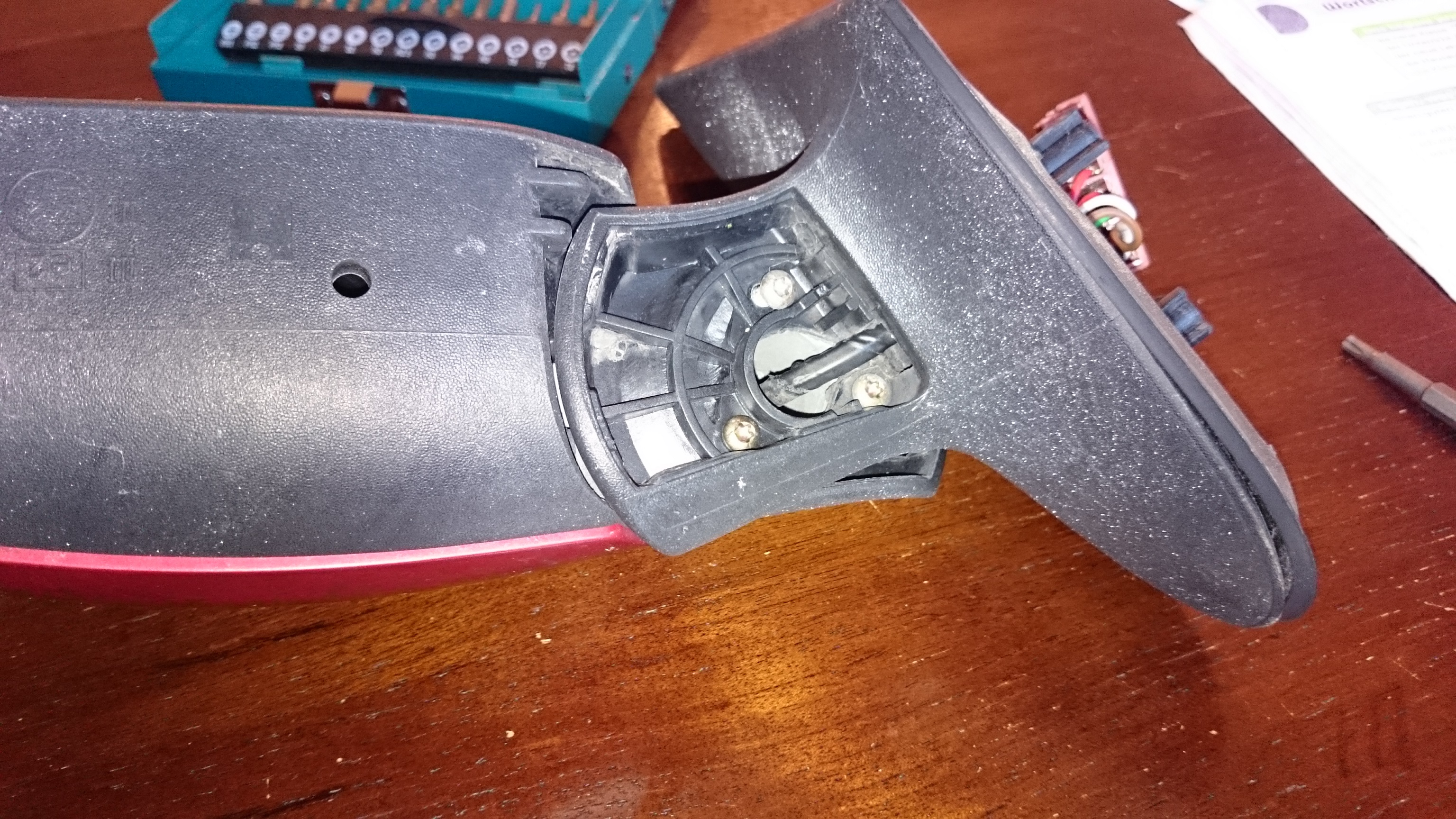 Du coup, vous pouvez retirer la glace , plus rien ne la retient ou presque! Il reste les fils rouges du dégivrage. A enlever facilement en tirant dessus doucement à la main ou avec une petite pince! Vous avez alors accès aux moteurs électriques de réglage!