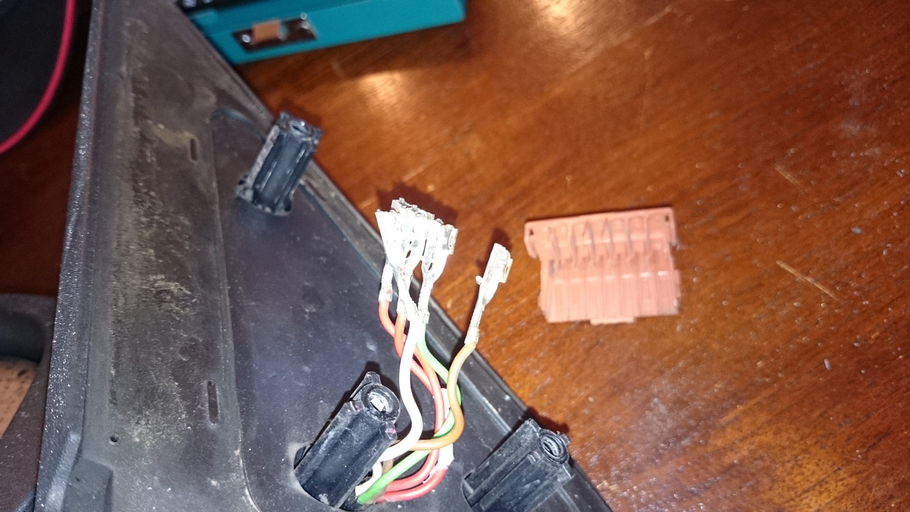 Afin de pouvoir défaire les 2 parties du rétro sans tirer sur les fils électriques, je repère les numéros avant et même je marque un des 2 fils rouges avec un bout de scotch de peintre blanc. ensuite, je défais le connecteur avec délicatesse, et je fais passer les câbles un par un dans le trou entre la partie fixe et la partie mobile.
