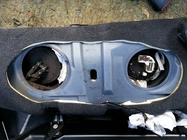 Aujourd'hui, Je démonte le garde boue et là je ne vois rien de spécial. tout est propre. le raccord à l'air encore bien souple et pas de trace de gasoil. Je regarde la RTA et quasi rien au sujet du réservoir et de son réseau. En fouillant sur le site, j'ai pu constater qu'il y avait 2 trappes d'accès sous la banquette. Je démonte ce qu'il faut et accèdent aux 2 trappes remplies de gasoil. J'éponge et me dis que si il y a du gasoil dans les deux c'est que le problème vient d'entre les deux. Je décide de faire l'appoint en gasoil pour me remettre en situation où ça va fuir. En effet la fuite se localise entre les deux trappes, seulement aucun accès n'est prévu, même en passant par le passage de câble.