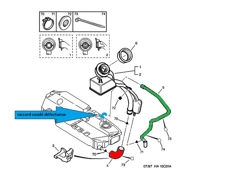 et là je vois que ce n'est pas ce fameux gros coude qui est en fin de vie mais une soudure plastique qui s'est défaite au niveau du retour d'essence (je crois que c'est ça), vers le 71 sur le schéma de neo888.