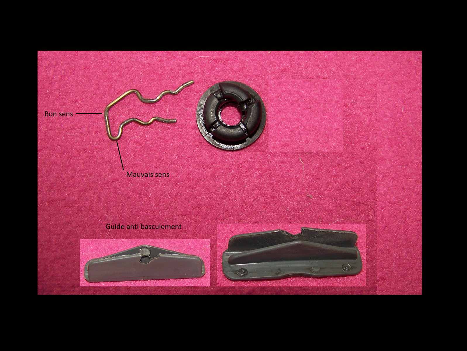 Autre pièce en plastique, la bague qui permet de fixer la vitre sur l’axe du lève-vitre et d’immobiliser celle-ci par une épingle en métal, même souci, au démontage, on ne vois pas bien comment enlever cette épingle, vu sa forme, j’ai pensé, à tort, qu’il fallait accrocher un laiton sur la petite boucle, une fois extraite, on voit la forme de cette épingle et je comprends, un peu tard, que ce n’était pas cela, donc même punition, à remplacer !