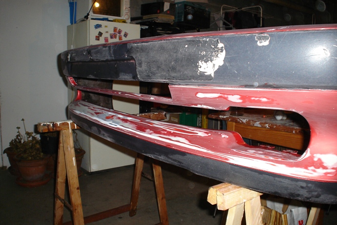 Puis le pare choc avant le plus long a faire et le pire c est d enlever la bande noir dessus car sa etai aprete peint en rouge puis noir pa dessus donc sa accroche bien pour enlever le mieu c est de le faire chauufer avec un seche cheveux au maxi!! et un cutter aune longue lame tout neuve et en 45 min tout etait enlever et nickel!!
