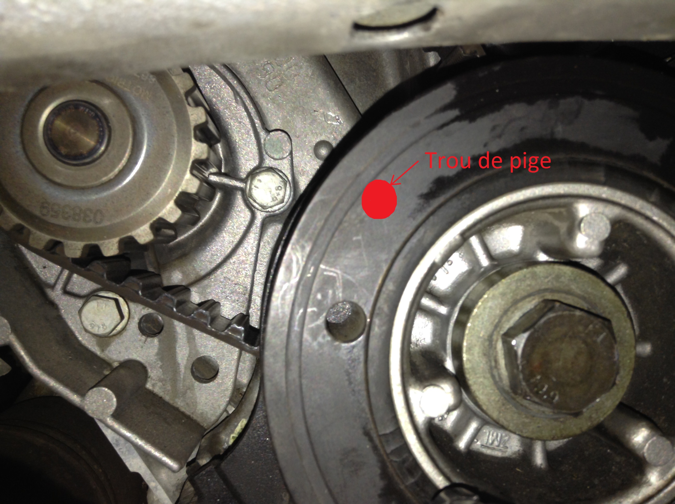 Sur la première photo les arbres à cames pigés et sur la deuxième photo la position du vilebrequin, j'ai indiqué en rouge la position du trou.