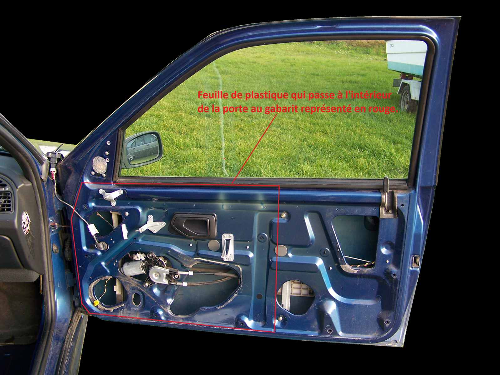 D'origine il y a déja une feuille plastique coincé dans le joint de maintient du panneaux de porte. elle permet de faire une étanchéité pour la poignée de porte intérieur. si tu retire la poignée (tu tire en arriére pouis elle va venir vers toi) tu doit voir cette feuille étanche.