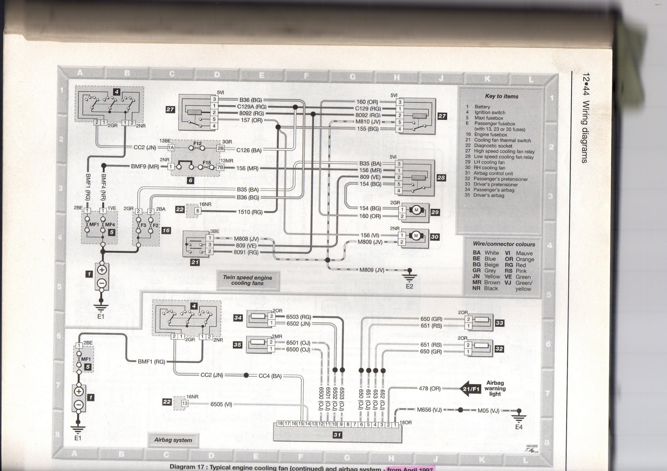Tu verras qu'il y a 2 ventilos, et 3 relais. Je penche pour 2 verts (qui font la GV sur chacun son ventilo, actionné par sonde de température moteur ou mise en service de la clim),