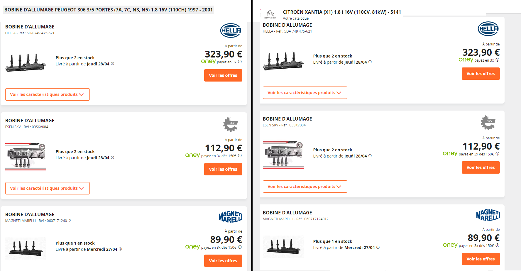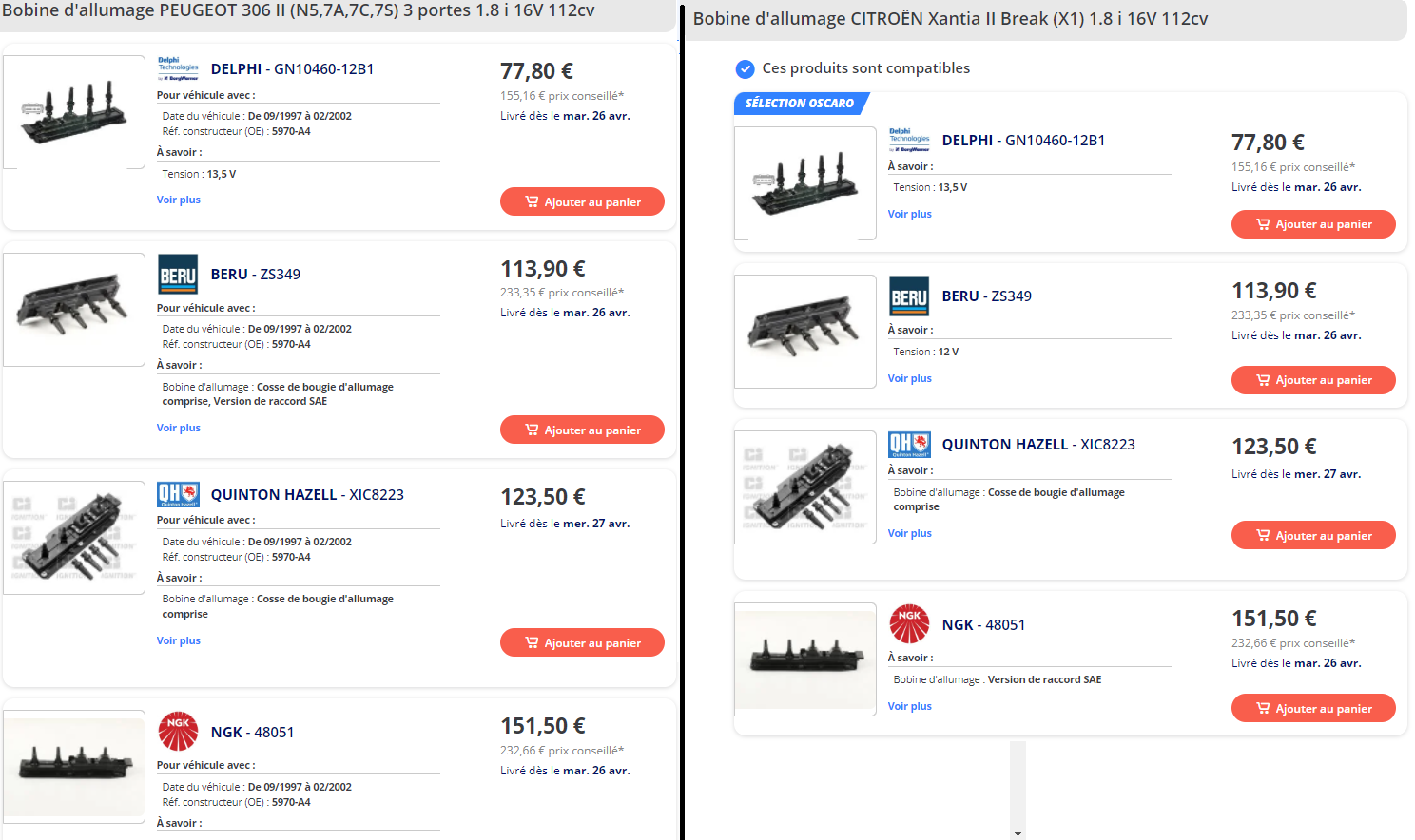 Par contre, les bobines différentes, ça m'étonne. J'ai fais une recherche sur Oscaro qui, pour mes deux véhicules (306 XS 1.8 16V de 2000 et Xantia 1.8 16V de 2000), les pièces proposées sont exactement les mêmes.