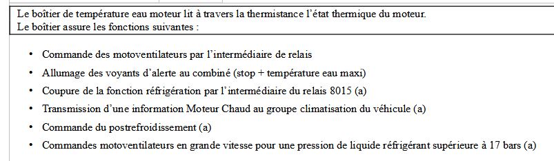 Ce boitier récupère l'info d'une des sondes ( la marron je crois), et en fonction de l'info reçue, il gère le déclenchement des ventilos (petite ou grande vitesse), et il gère également l'allumage du voyant "stop".