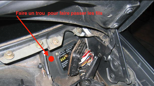 Maintenant il faut faire un trou dans la caisse pour ramener les fils derrière le tableau de bord choisissez l’endroit que vous voulez, moi j’ai dû démonter mes essuie-glaces puis le moteur d’essuie-glaces et faire un trou à côté de prise carré du faisceau moteur :
