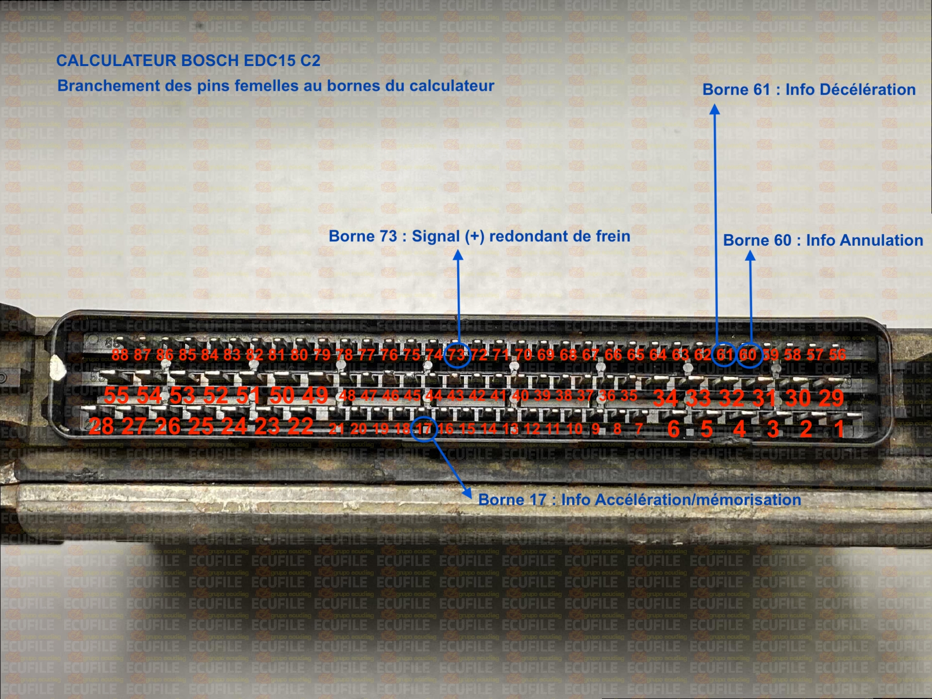 Le calculateur EDC15 possède 88 voies, ses bornes ont toutes une fonction précise, voici les bornes qui gère la régulation de vitesse pour votre véhicule :